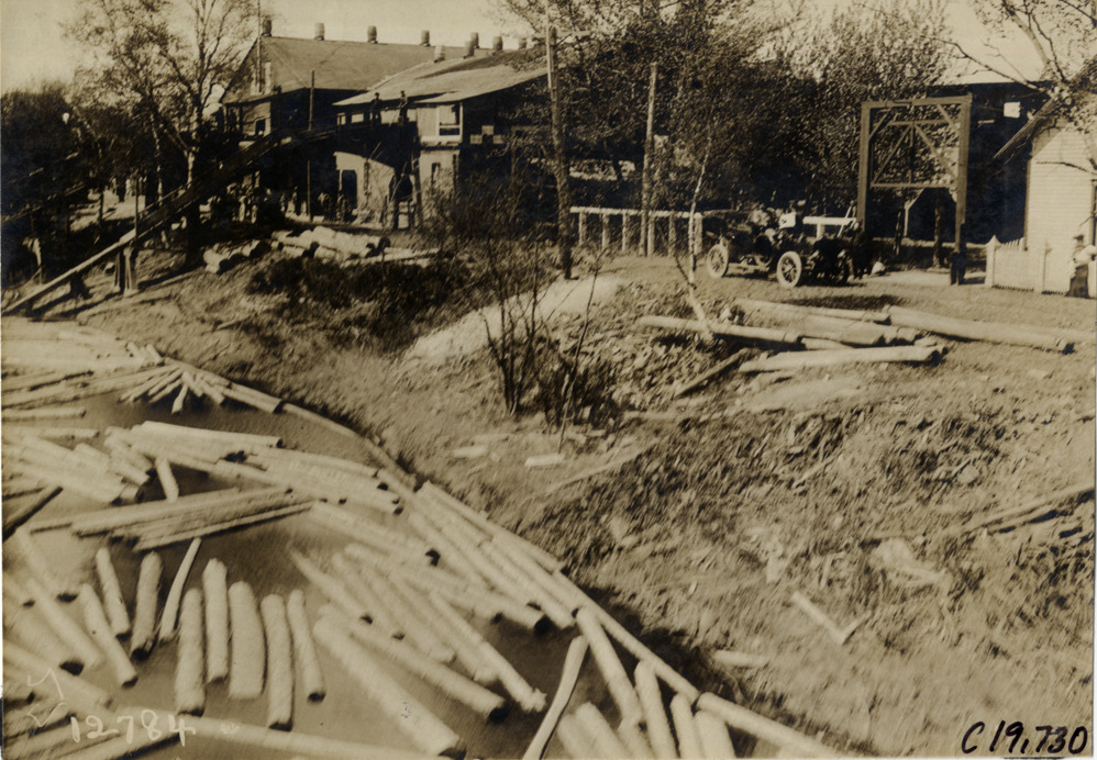 View of car parked near sawmill with log chute during the pathfinding expedition for the 1906 Glidden Tour. Logs float in river on left. Handwritten on back: "Tours--Glidden Tour Pathfinder, 1906."