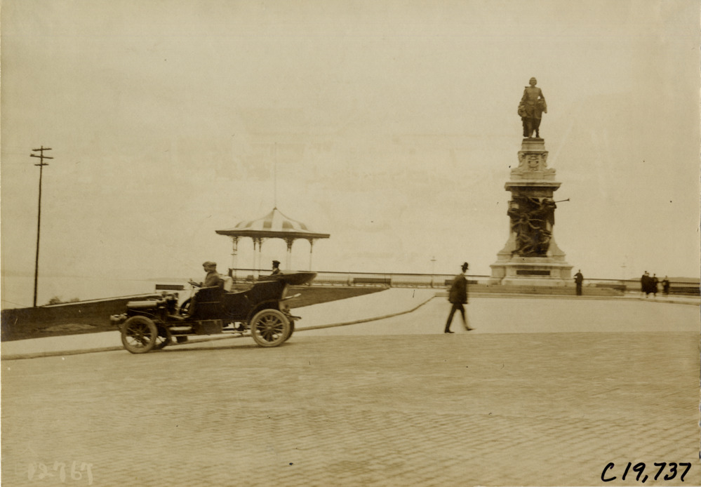 Automobile parked in front of Samuel de Champlain monument at Quebec City, 1906 Glidden pathfinding expedition