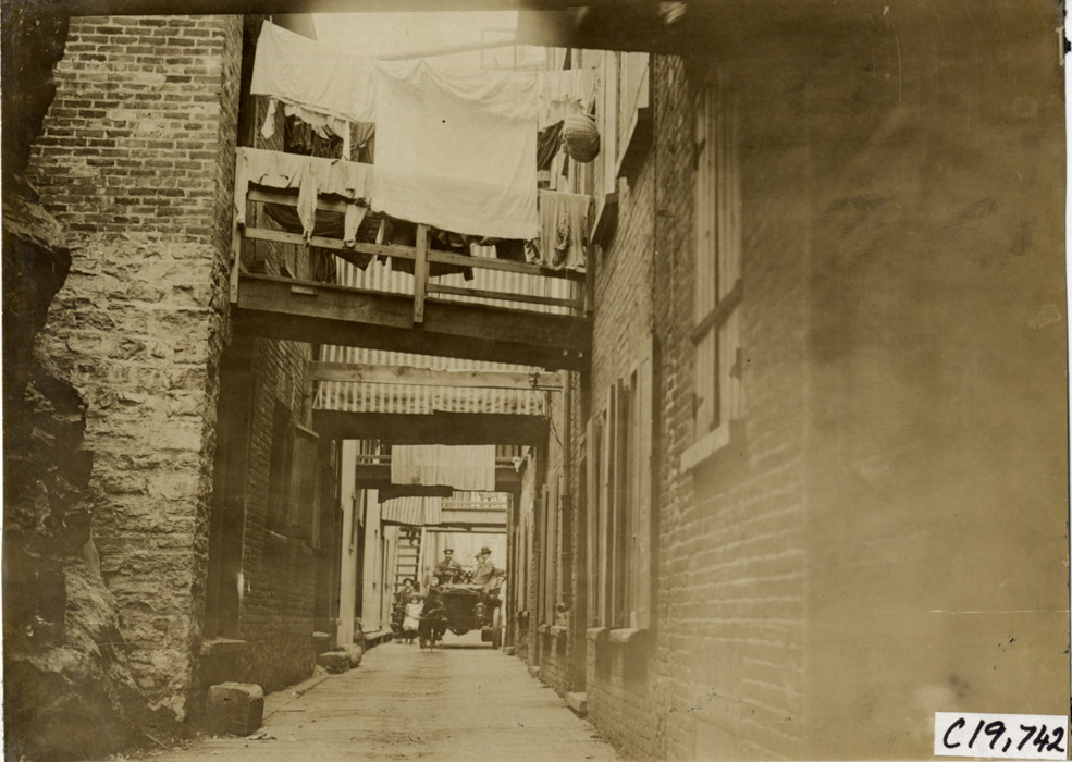 View of motorists and children with car on narrow residential street during the pathfinding expedition for the 1906 Glidden Tour. Laundry hangs from clotheslines and balconies. Handwritten on back: "Tours--Glidden Tour Pathfinder, 1906."