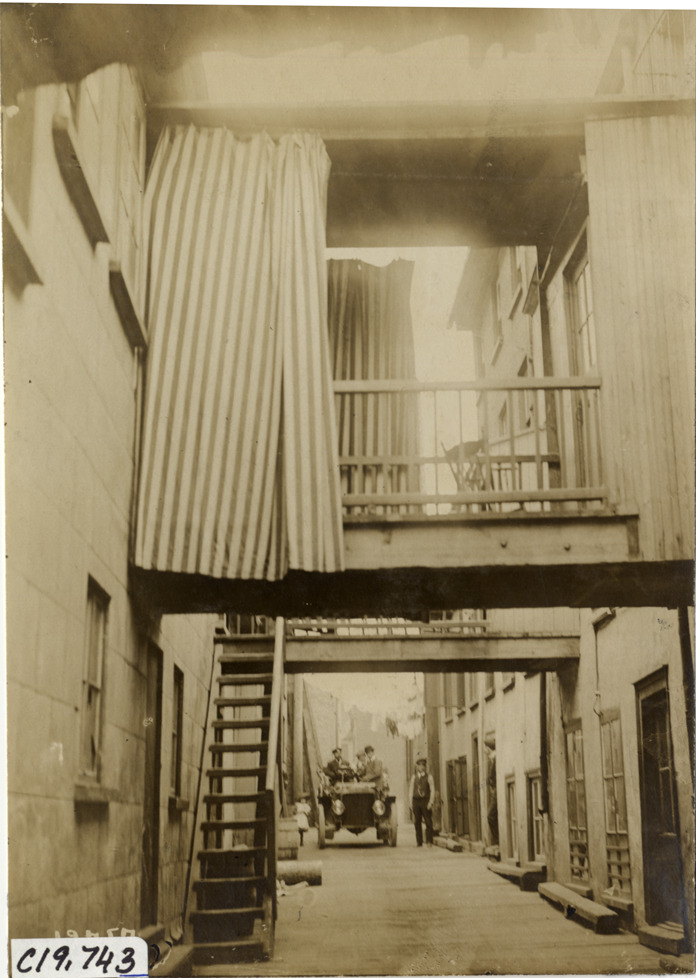 View of motorists in car on narrow residential street during the pathfinding expedition for the 1906 Glidden Tour. Striped curtains cover balconies over street. Handwritten on back: "Tours--Glidden Tour Pathfinder, 1906."