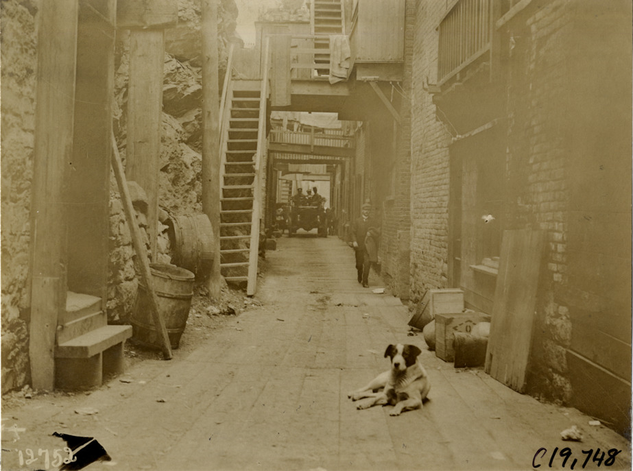 Dog laying in middle of narrow street, 1906 Glidden pathfinding expedition