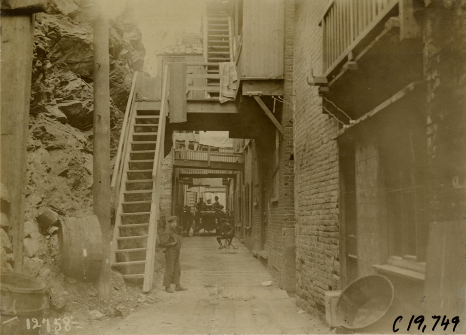 View of motorists and children with car on narrow residential street during the pathfinding expedition for the 1906 Glidden Tour. Boy rides tricycle; stairs in foreground. Handwritten on back: "Tours--Glidden Tour Pathfinder, 1906."
