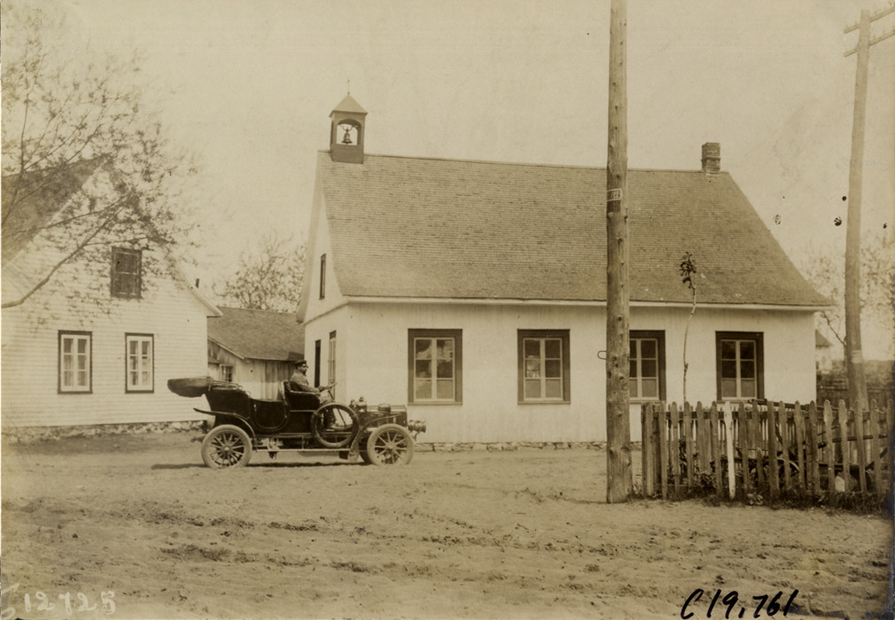 View of motorists in car parked in front of schoolhouse during the pathfinding expedition for the 1906 Glidden Tour. Handwritten on back: "Tours--Glidden Tour Pathfinder, 1906."