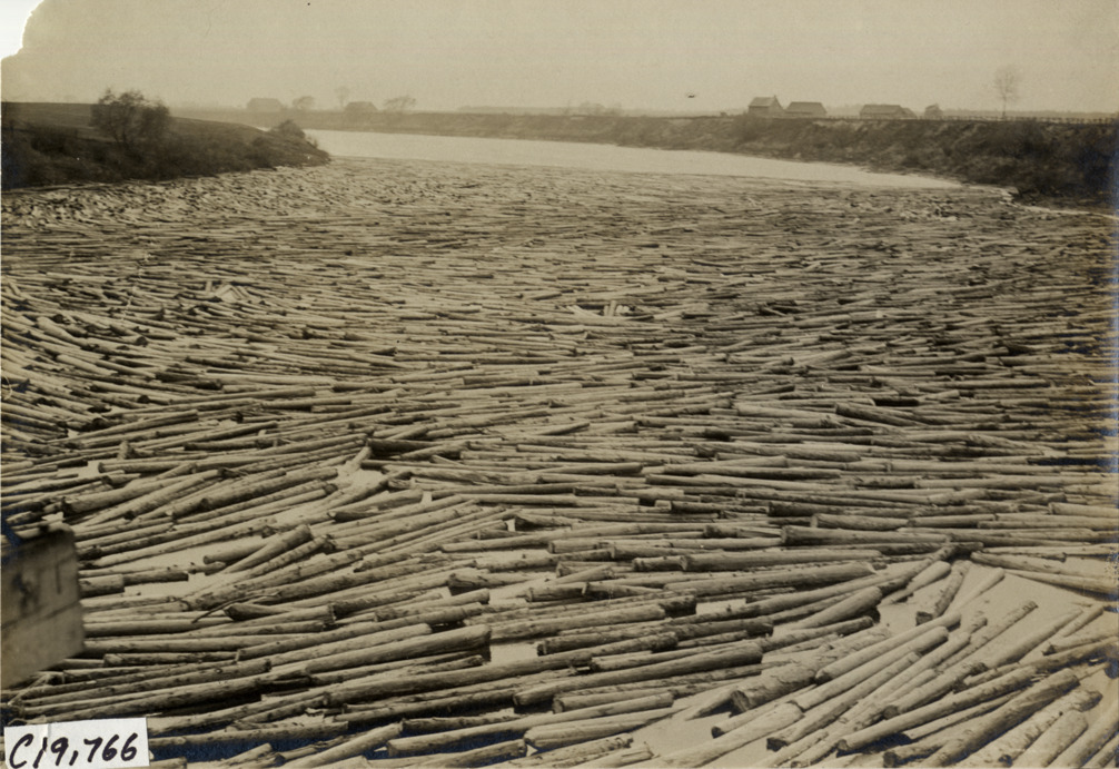View of logs floating in river during the pathfinding expedition for the 1906 Glidden Tour. Handwritten on back: "Tours--Glidden Tour Pathfinder, 1906."