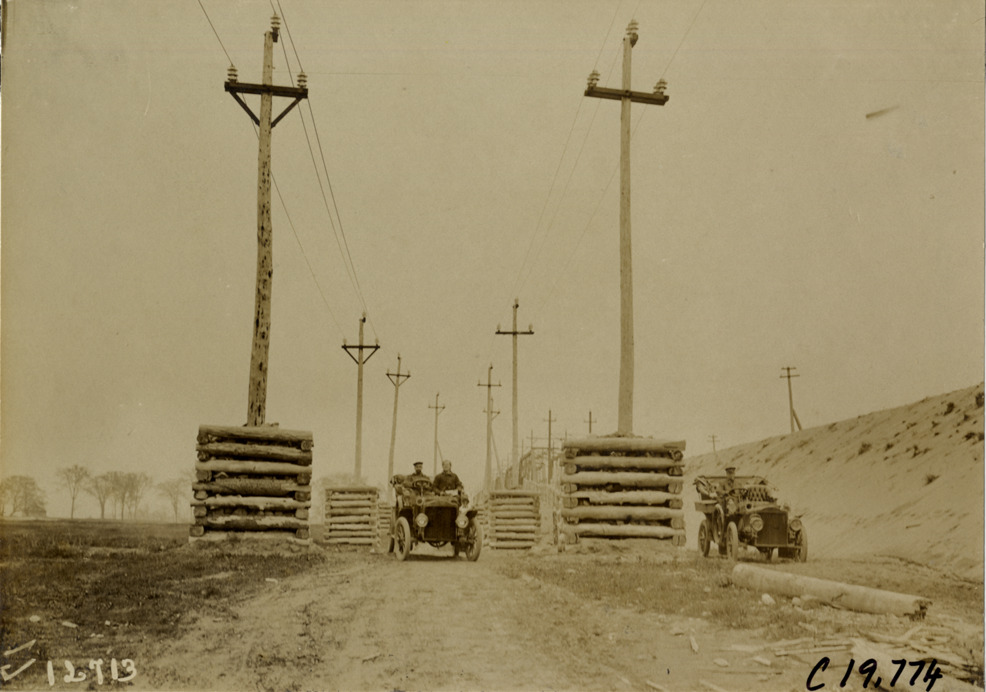 View of motorists in cars passing between electric utility poles during the pathfinding expedition for the 1906 Glidden Tour. Handwritten on back: "Tours--Glidden Tour Pathfinder, 1906."