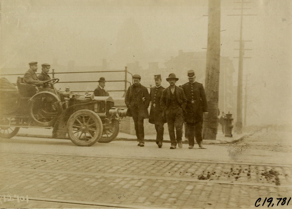 Police escorting two men across street, 1906 Glidden pathfinding expedition