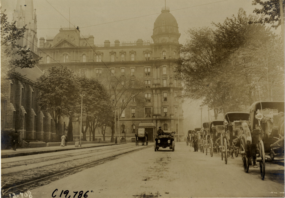 View of driver in car passing row of horse-drawn carriages at Montreal, Quebec during the pathfinding expedition for the 1906 Glidden Tour. Windsor Hotel in background. Handwritten on back: "Tours--Glidden Tour Pathfinder, 1906."