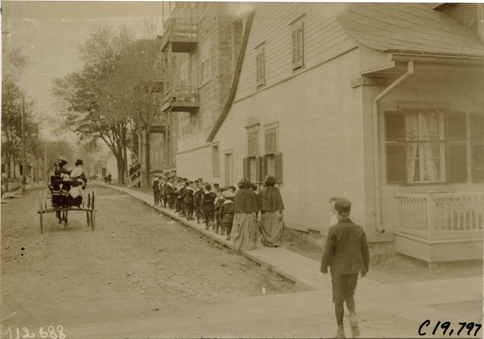 Schoolboys walking on sidewalk, 1906 Glidden pathfinding expedition