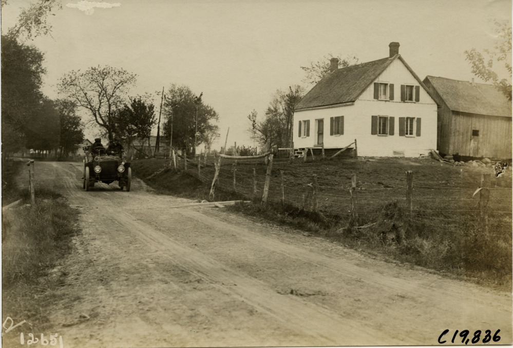 Motorists in automobile passing farmhouse, 1906 Glidden pathfinding expedition