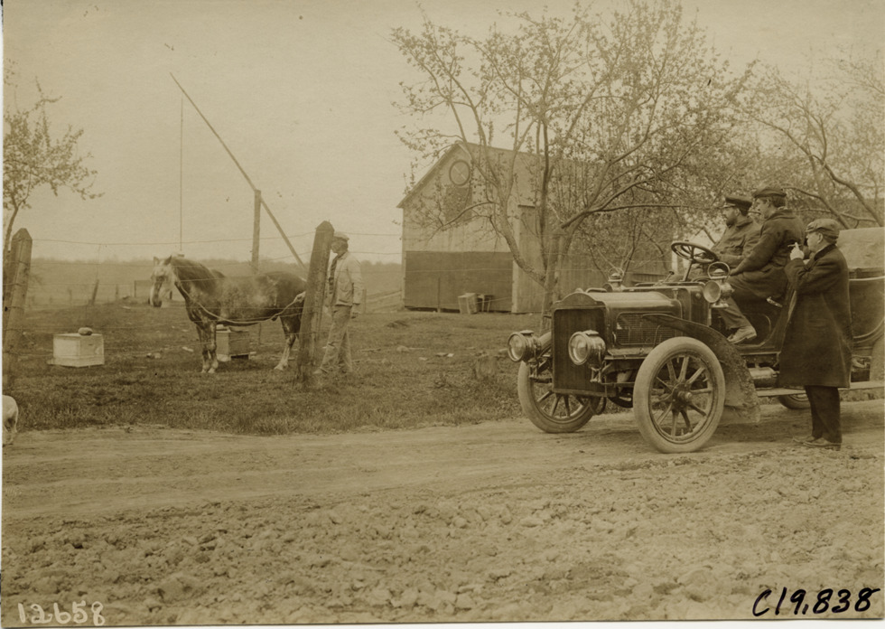 View of man with horse on roadside during the pathfinding expedition for the 1906 Glidden Tour. Three men with car watch from road; barn in background. Handwritten on back: "Tours--Glidden Tour Pathfinder, 1906."