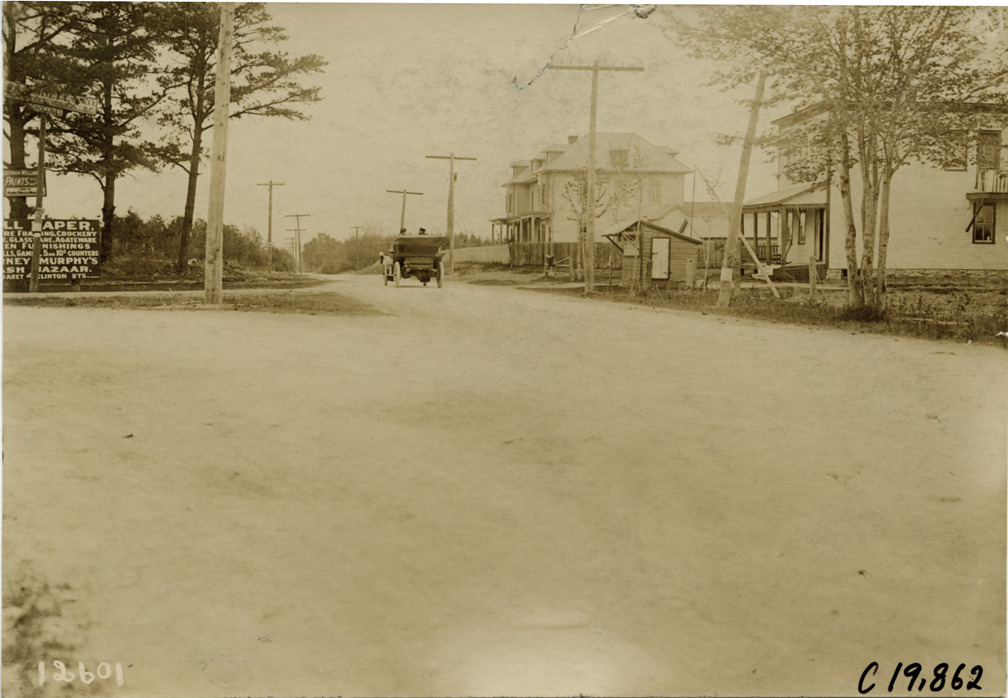 Rear view of motorist in car traveling on dirt road past houses during the pathfinding expedition for the 1906 Glidden Tour. Handwritten on back: "Tours--Glidden Tour Pathfinder, 1906."