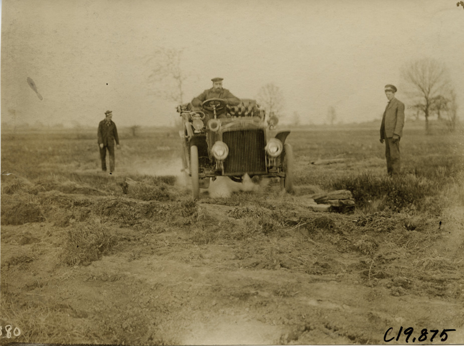Driver in automobile on uneven dirt road, 1906 Glidden pathfinding expedition