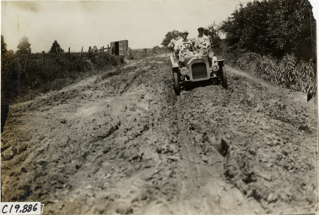 View of motorists in car traveling on rural dirt road during the 1907 Glidden Tour. Stamped on back: "Photo by N. Lazarnick, 29 West 42nd Street, New York." Handwritten on back: "Tours--Glidden Tour, 1907."