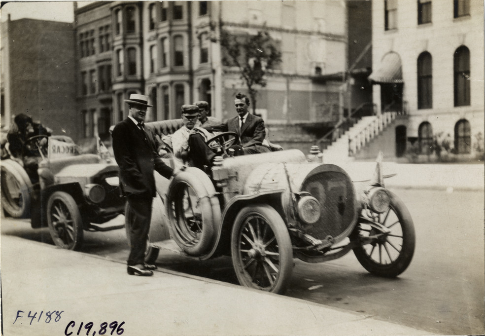 View of several men posing with car during the 1907 Glidden Tour. Buildings in background. Stamped on back: "Photo by N. Lazarnick, 29 West 42nd Street, New York." Handwritten on back: "Tours--Glidden Tour, 1907."