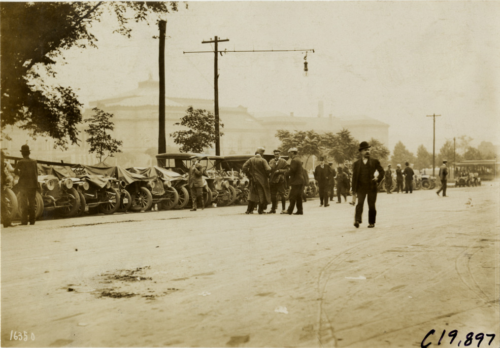 Automobiles lined up in street at Baltimore, Maryland, 1907 Glidden Tour