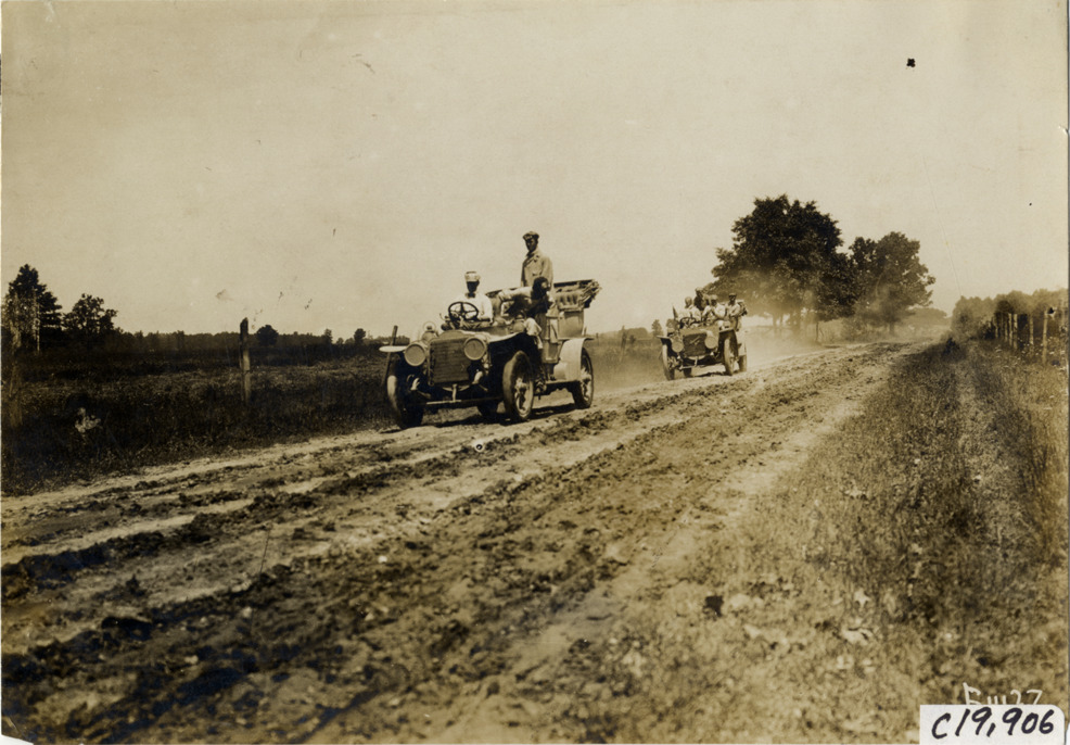 View of motorists in two cars traveling on rural dirt road during the 1907 Glidden Tour. Stamped on back: "Photo by N. Lazarnick, 29 West 42nd Street, New York." Handwritten on back: "Tours--Glidden Tour, 1907."