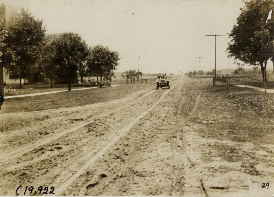 Distant view of motorists in car traveling on rural dirt road during the 1907 Glidden Tour. Stamped on back: "Photo by N. Lazarnick, 29 West 42nd Street, New York." Handwritten on back: "Tours--Glidden Tour, 1907."