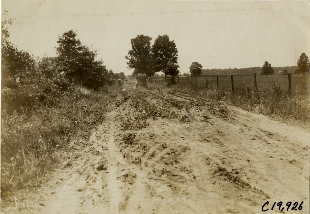 Distant rear view of car traveling on rural dirt road during the 1907 Glidden Tour. Stamped on back: "Photo by N. Lazarnick, 29 West 42nd Street, New York." Handwritten on back: "Tours--Glidden Tour, 1907."