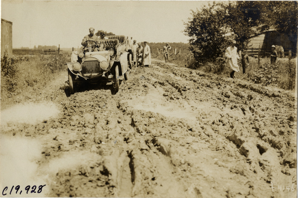 Motorists with automobiles on muddy rural road, 1907 Glidden Tour