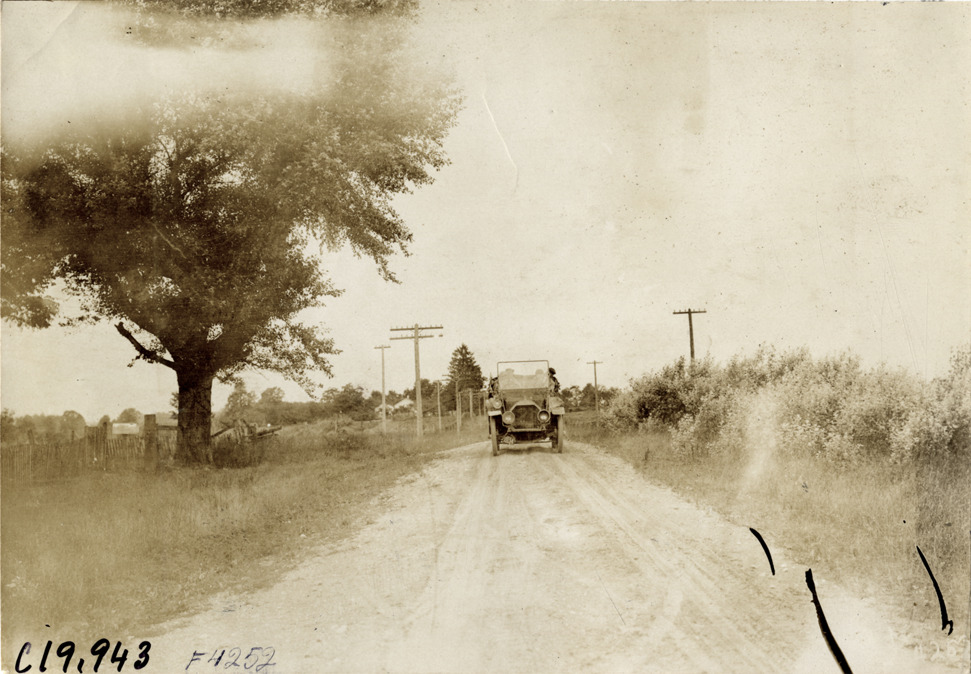 View of motorists in car traveling on rural dirt road during the 1907 Glidden Tour. Stamped on back: "Photo by N. Lazarnick, 29 West 42nd Street, New York." Handwritten on back: "Tours--Glidden Tour, 1907."