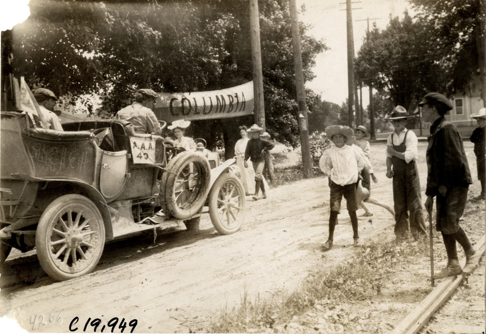 View of group of boys greeting motorists in car no. 40 during the 1907 Glidden Tour. "Columbia" banner in background. Stamped on back: "Photo by N. Lazarnick, 29 West 42nd Street, New York." Handwritten on back: "Tours--Glidden Tour, 1907."