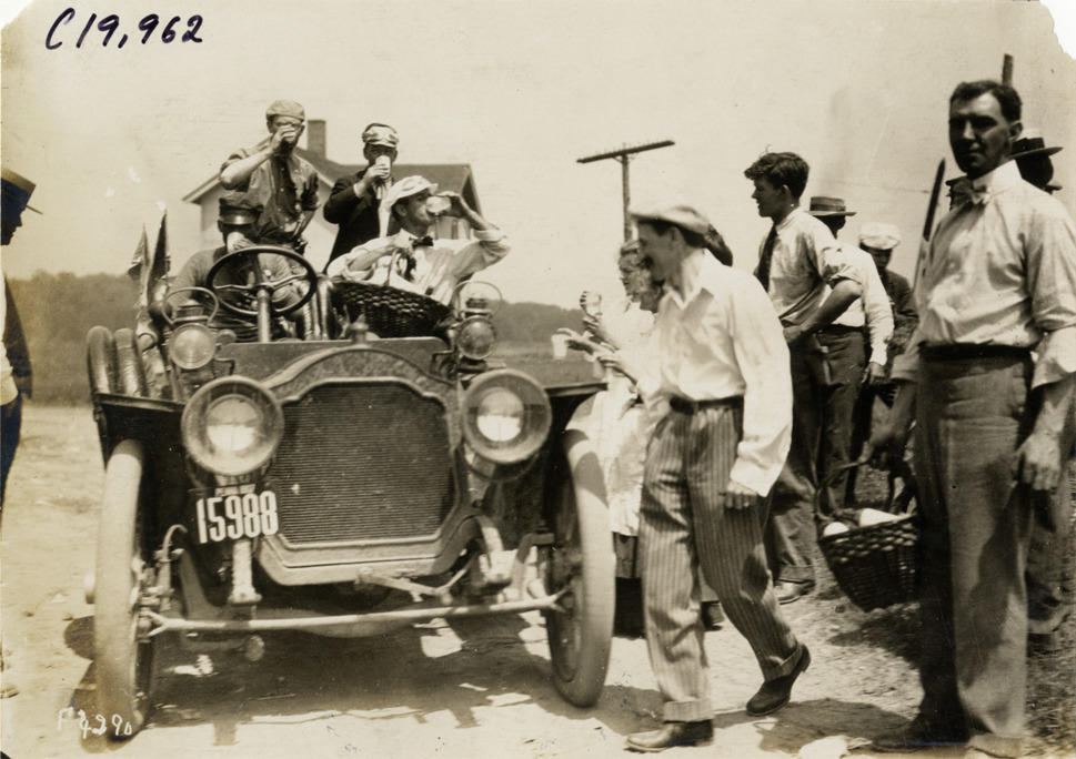 View of motorists in car drinking beverages during the 1907 Glidden Tour. Man on passenger side holds a basket. Stamped on back: "Photo by N. Lazarnick, 29 West 42nd Street, New York." Handwritten on back: "Tours--Glidden Tour, 1907."