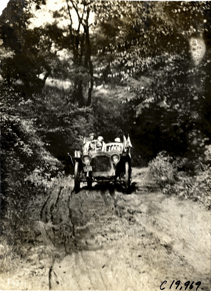 View of motorists in car on dirt road during the 1907 Glidden Tour. Stamped on back: "Photo by N. Lazarnick, 29 West 42nd Street, New York." Handwritten on back: "Tours--Glidden Tour, 1907."