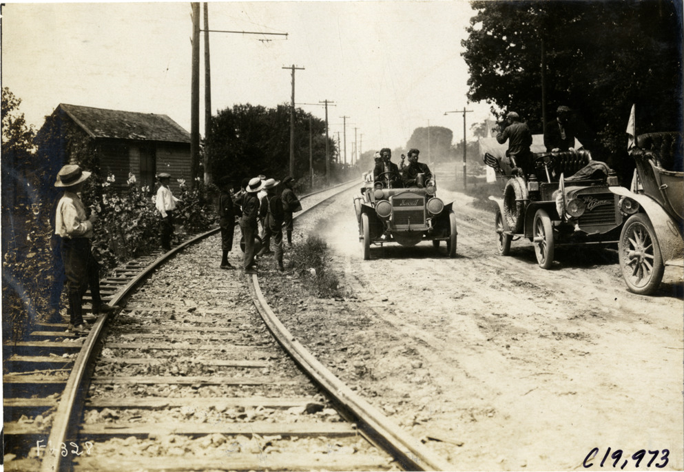 View of motorists in Maxwell and Acme cars passing group of boys on railroad tracks at Columbus, Ohio during the 1907 Glidden Tour. Stamped on back: "Photo by N. Lazarnick, 29 West 42nd Street, New York." Handwritten on back: "Tours--Glidden Tour, 1907."