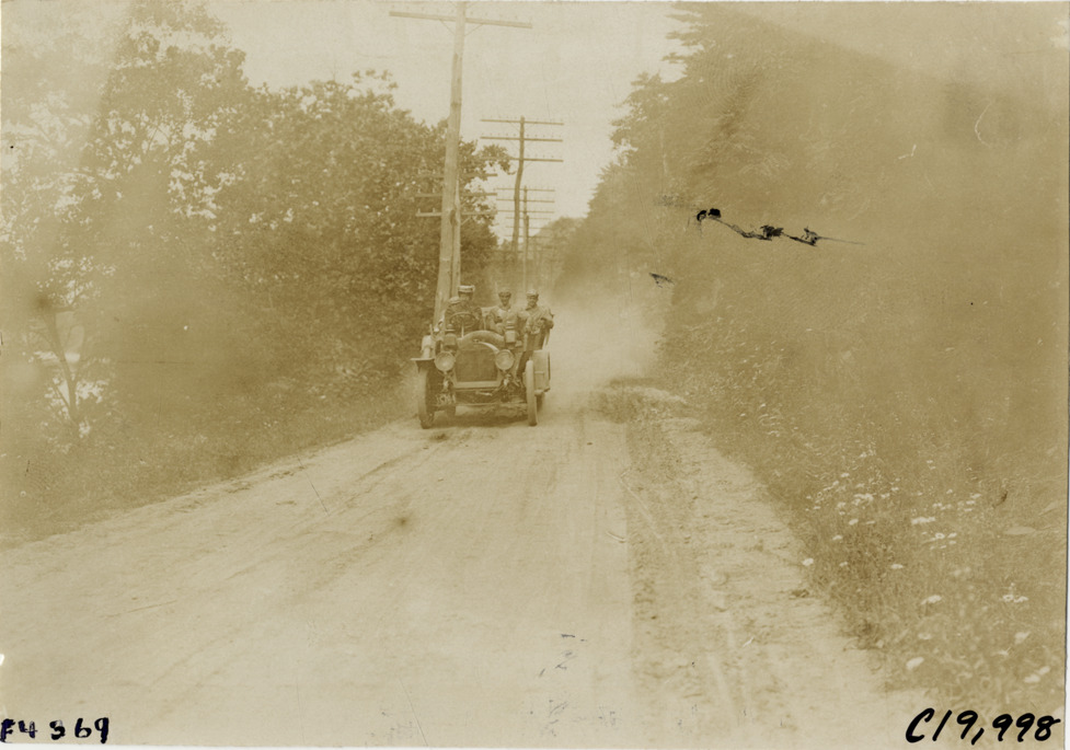 View of motorists in car traveling on rural dirt road during the 1907 Glidden Tour. Stamped on back: "Photo by N. Lazarnick, 29 West 42nd Street, New York." Handwritten on back: "Tours--Glidden Tour, 1907."