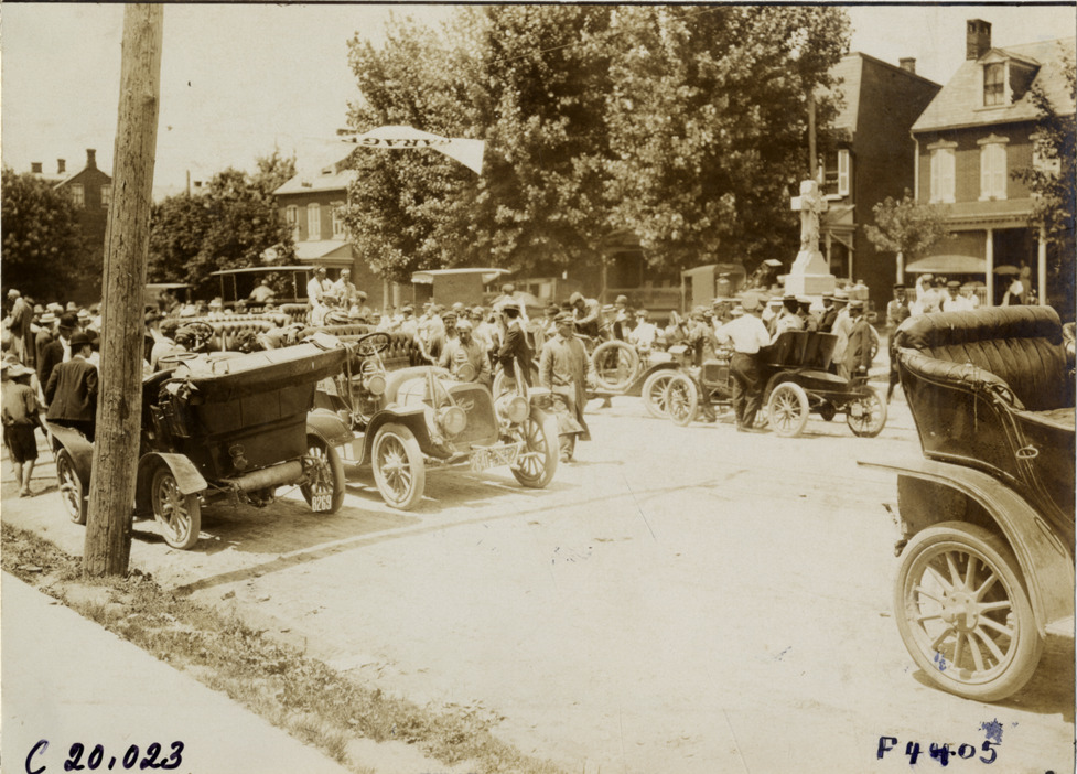 View of motorists with cars on crowded residential street during the 1907 Glidden Tour. Truck hauling stone cemetery monument in background. Handwritten on back: "Tours--Glidden Tour, 1907."