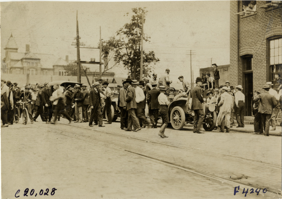 View of spectators surrounding cars in street during the 1907 Glidden Tour. Brick building in background. Stamped on back: "Photo by N. Lazarnick, 29 West 42nd Street, New York." Handwritten on back: "Tours--Glidden Tour, 1907."