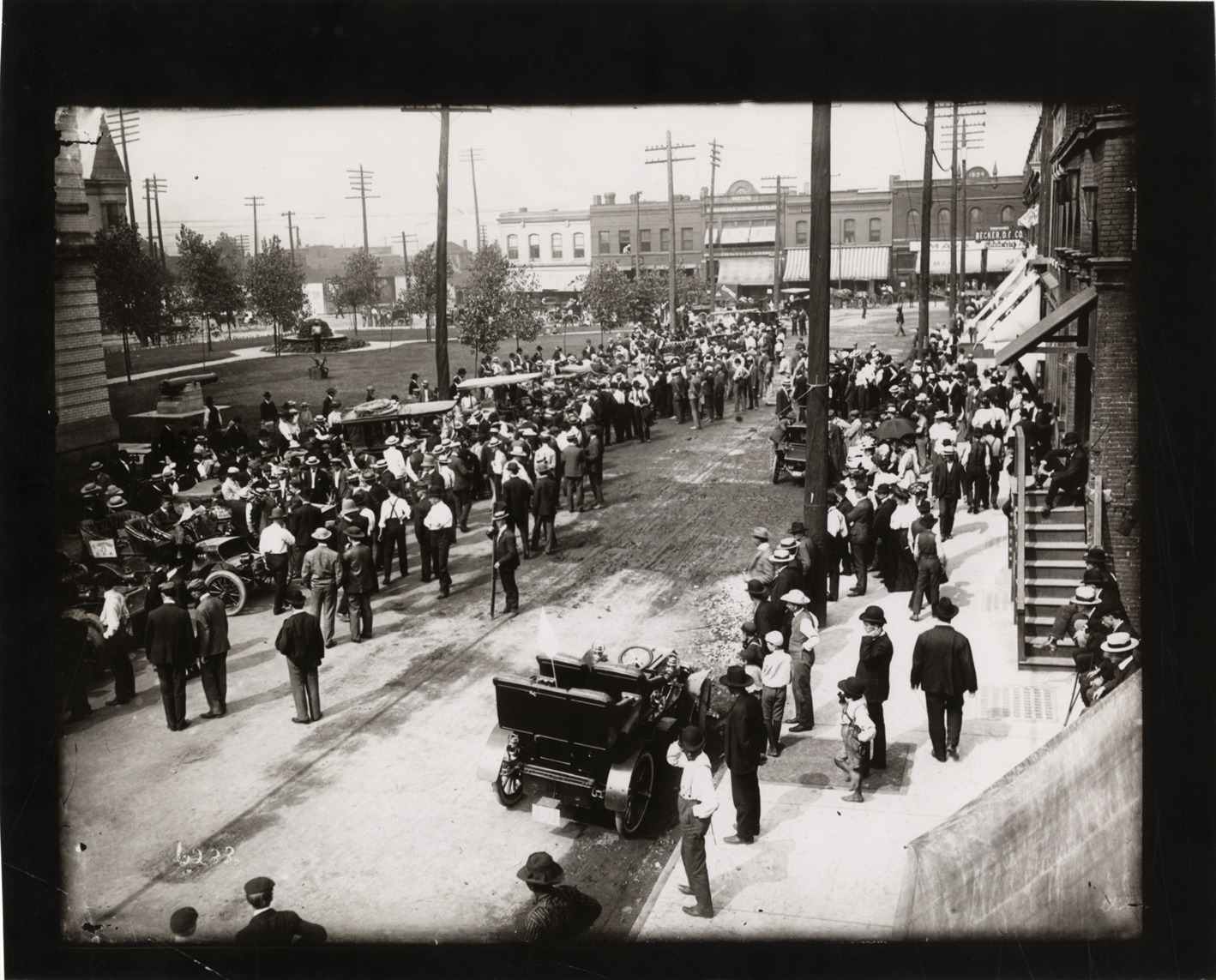 Bird's-eye view of spectators surrounding cars in street during the 1907 Glidden Tour. Park with fountain and cannon on left; commercial buildings in background. Stamped on back: "Photographic illustration by Nick Lazarnick, 230 Park Ave., N.Y." Handwritten on back: "Tours--Glidden Tour, 1907."