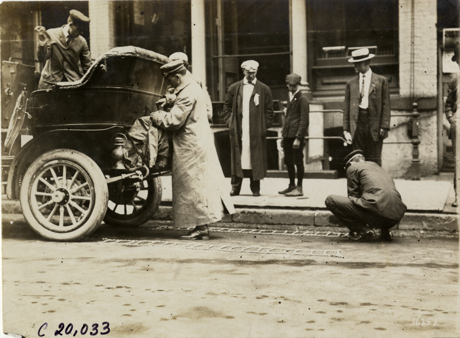 View of men putting tire chains on car during the 1907 Glidden Tour. Onlookers watch from sidewalk. Stamped on back: "Photo by N. Lazarnick, 29 West 42nd Street, New York." Handwritten on back: "Tours--Glidden Tour, 1907."
