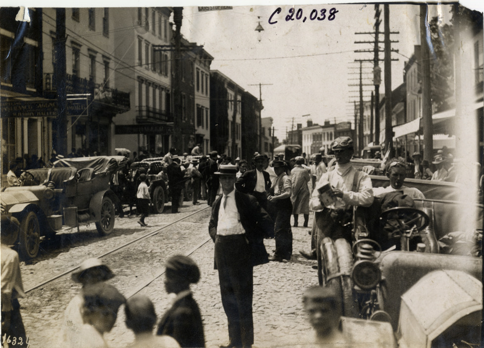 Motorists with automobiles in street at Fredericksburg, Pennsylvania, 1907 Glidden Tour