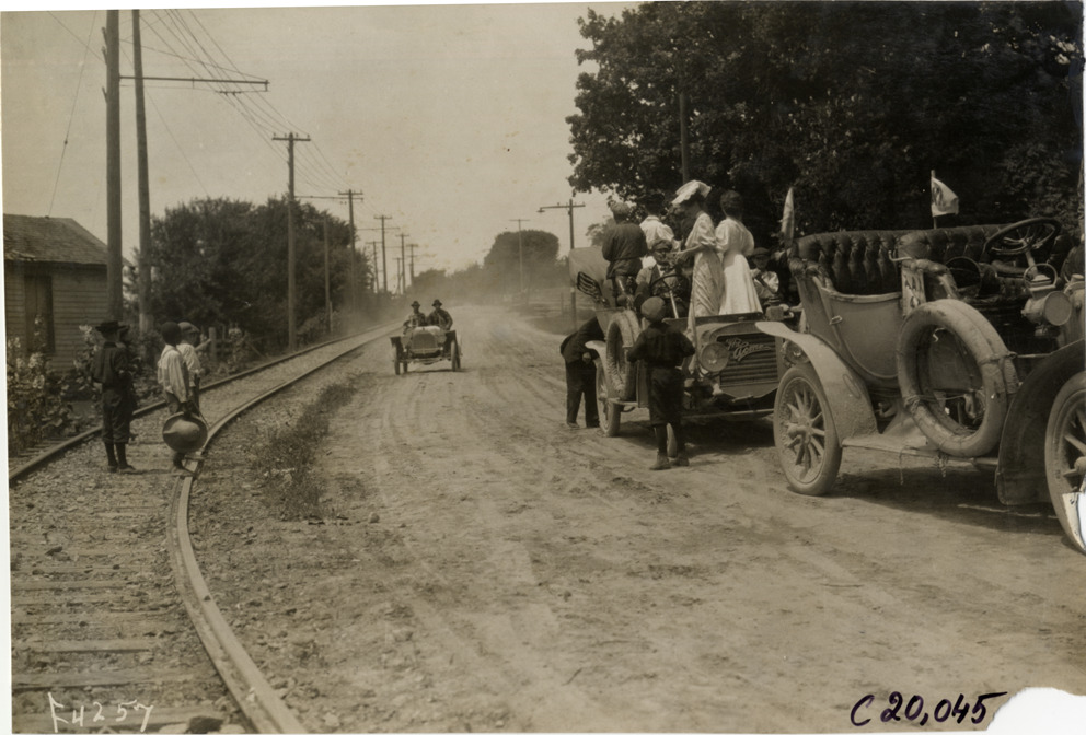 View of women in Acme car giving souvenirs to motorists at Columbus, Ohio during the 1907 Glidden Tour. Group of boys stands on railroad tracks; another car in background. Stamped on back: "Photo by N. Lazarnick, 29 West 42nd Street, New York." Handwritten on back: "Columbus girls giving souvenirs to the drivers. Tours--Glidden Tour, 1907."