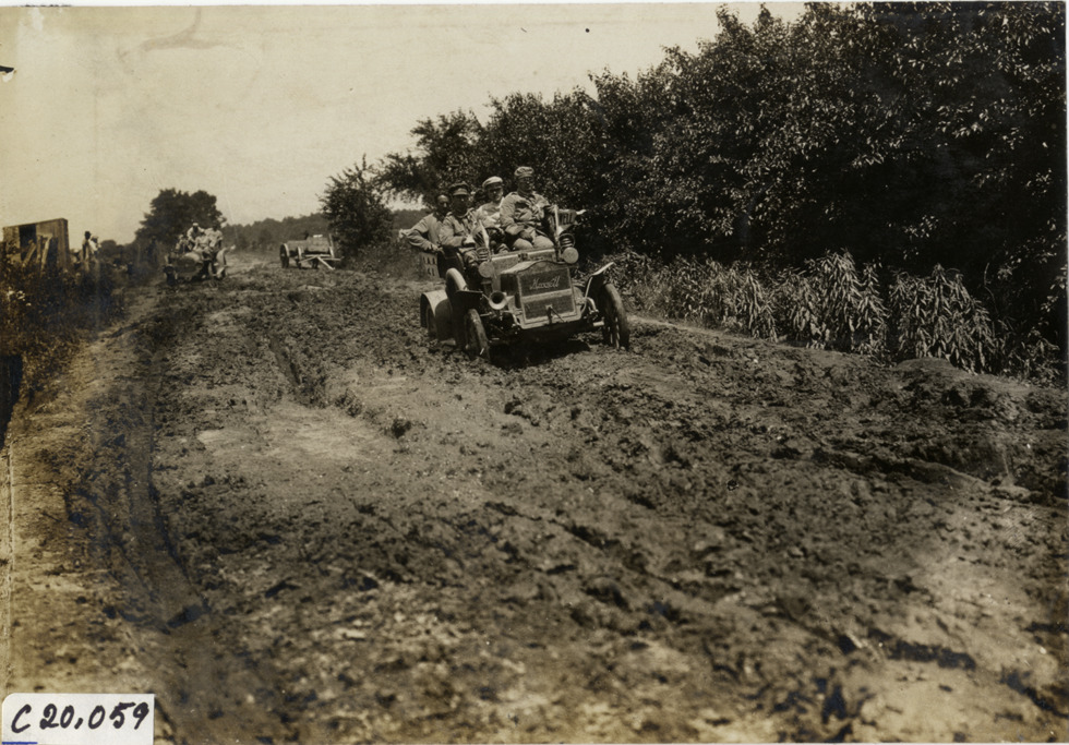 Motorists in Maxwell automobile traveling on muddy rural road, 1907 Glidden Tour