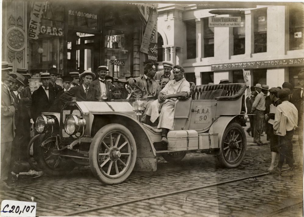 View of motorists in Peerless car no. 50 parked in street during the 1907 Glidden Tour. Storefront and spectators in background. Stamped on back: "Photo by N. Lazarnick, 29 West 42nd Street, New York." Handwritten on back: "Tours--Glidden Tour, 1907."
