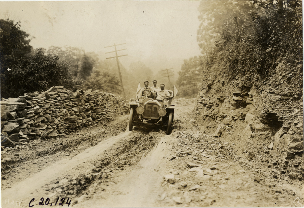 Motorists in Peerless automobile traveling on mountain road in Pennsylvania, 1907 Glidden Tour