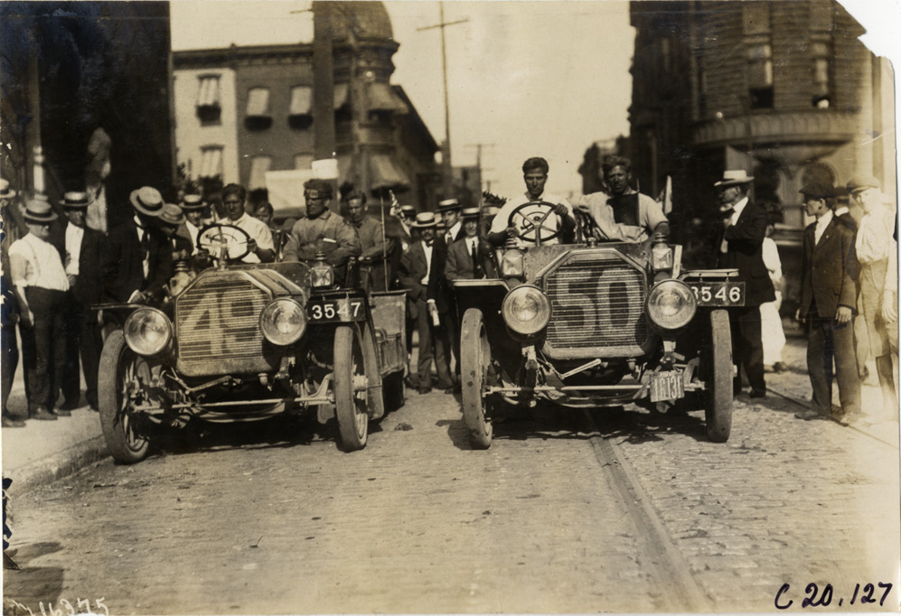 View of motorists in Peerless cars no. 49 and no. 50 parked side by side in street during the 1907 Glidden Tour. Spectators in background. Stamped on back: "Photo by N. Lazarnick, 29 West 42nd Street, New York." Handwritten on back: "Tours--Glidden Tour, 1907."