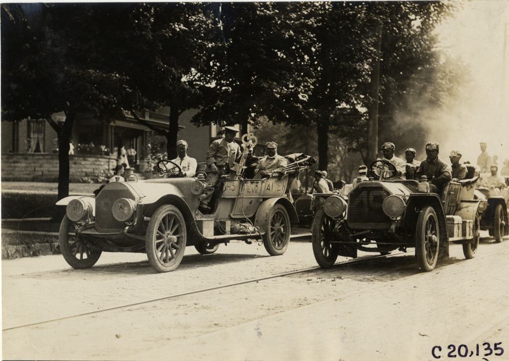 View of the mayor of Canton, Ohio, Charles J. Glidden and F.B. Hower in car during the 1907 Glidden Tour. Mayor holds key to the city of Canton; motorists in Peerless car no. 49 on right. Key reads: "Canton, Glidden tourists, 1907." Handwritten on back: "Tours--Glidden Tour, 1907."