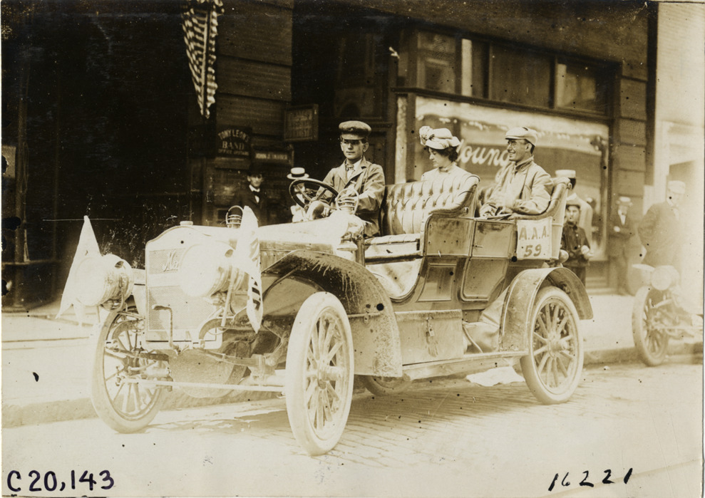 View of driver and passenger in Maxwell car no. 59 during the 1907 Glidden Tour. Stamped on back: "Photo by N. Lazarnick, 29 West 42nd Street, New York." Handwritten on back: "Tours--Glidden Tour, 1907."