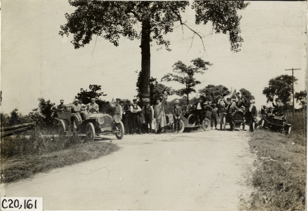 View of motorists posing with cars on rural dirt road during the 1907 Glidden Tour. Stamped on back: "Photo by N. Lazarnick, 29 West 42nd Street, New York." Handwritten on back: "Tours--Glidden Tour, 1907."