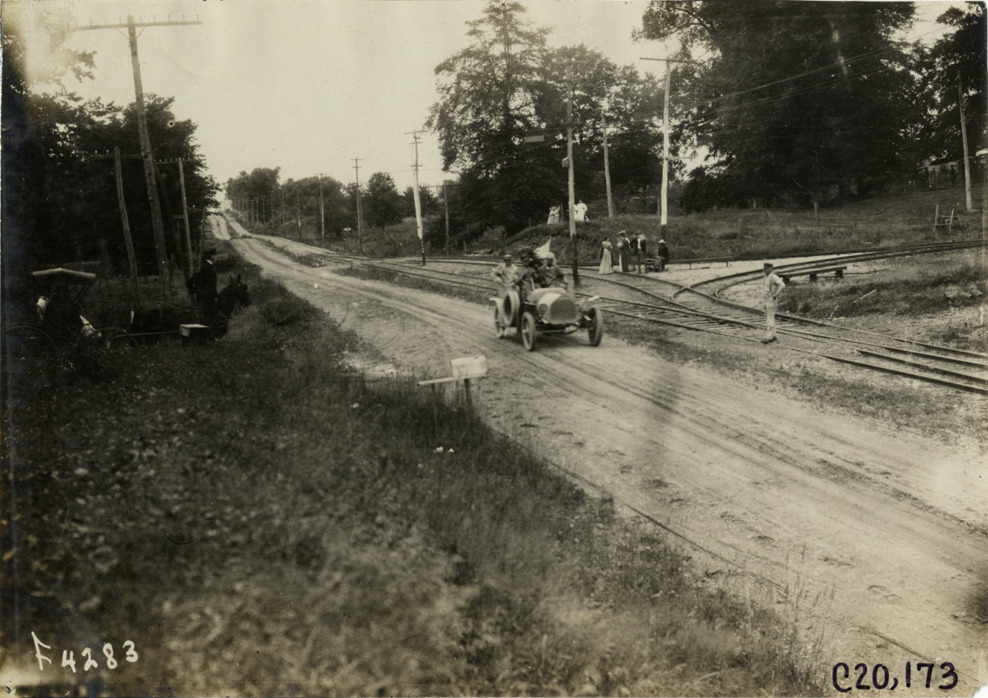 View of motorists in car traveling on rural dirt road adjacent to railroad tracks during the 1907 Glidden Tour. Spectators on roadside. Stamped on back: "Photo by N. Lazarnick, 29 West 42nd Street, New York." Handwritten on back: "Tours--Glidden Tour, 1907."