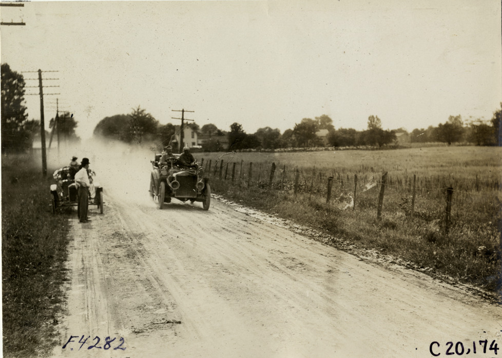 Motorists in automobile traveling on rural road, 1907 Glidden Tour