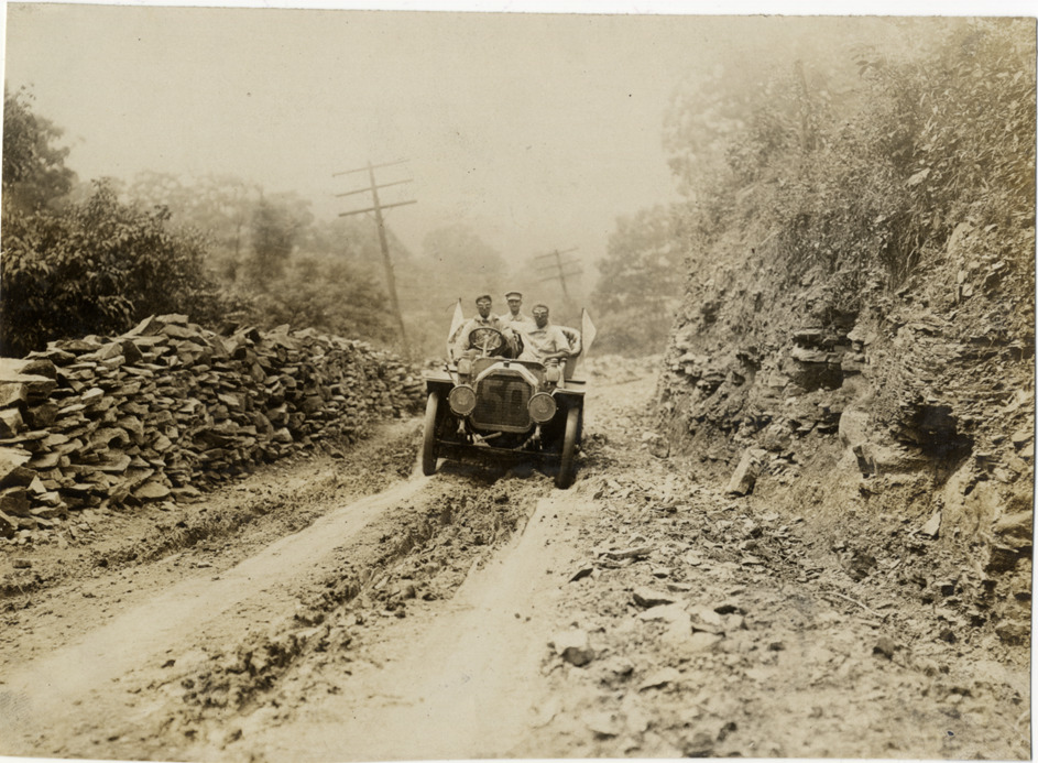 View of W.C. Straub and passengers in Peerless car no. 50 on mountain road in Pennsylvania during the 1907 Glidden Tour. Stamped on back: "Photo by N. Lazarnick, 29 West 42nd Street, New York." Handwritten on back: "Peerless #50. A stony Glidden Tour road in Pennsylvania, Straub's Peerless in the ravine. Tours--Glidden Tour, 1907."