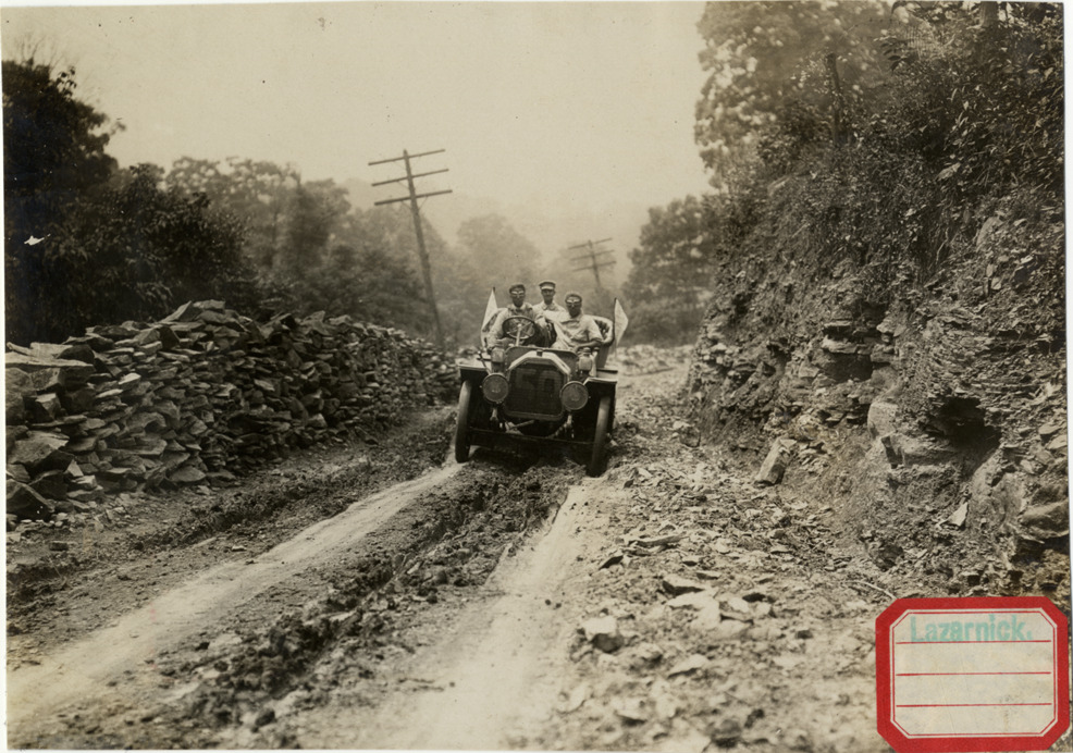 View of W.C. Straub and passengers in Peerless car no. 50 on mountain road in Pennsylvania during the 1907 Glidden Tour. Stamped on front: "Lazarnick." Stamped on back: "Photo by N. Lazarnick, 29 West 42nd Street, New York." Handwritten on back: "Peerless #50. Tours--Glidden Tour, 1907."