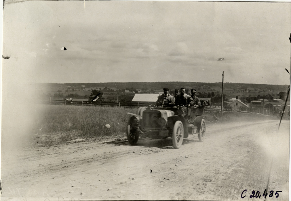 Motorists in Stevens-Duryea automobile traveling on rural road, 1908 Glidden Tour