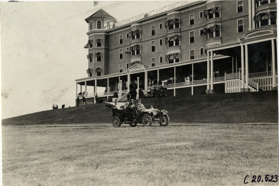 View of motorists in car parked in front of Summit Springs Hotel at Poland, Maine during the 1908 Glidden Tour. Handwritten on back: "Tours--Glidden Tour, 1908."