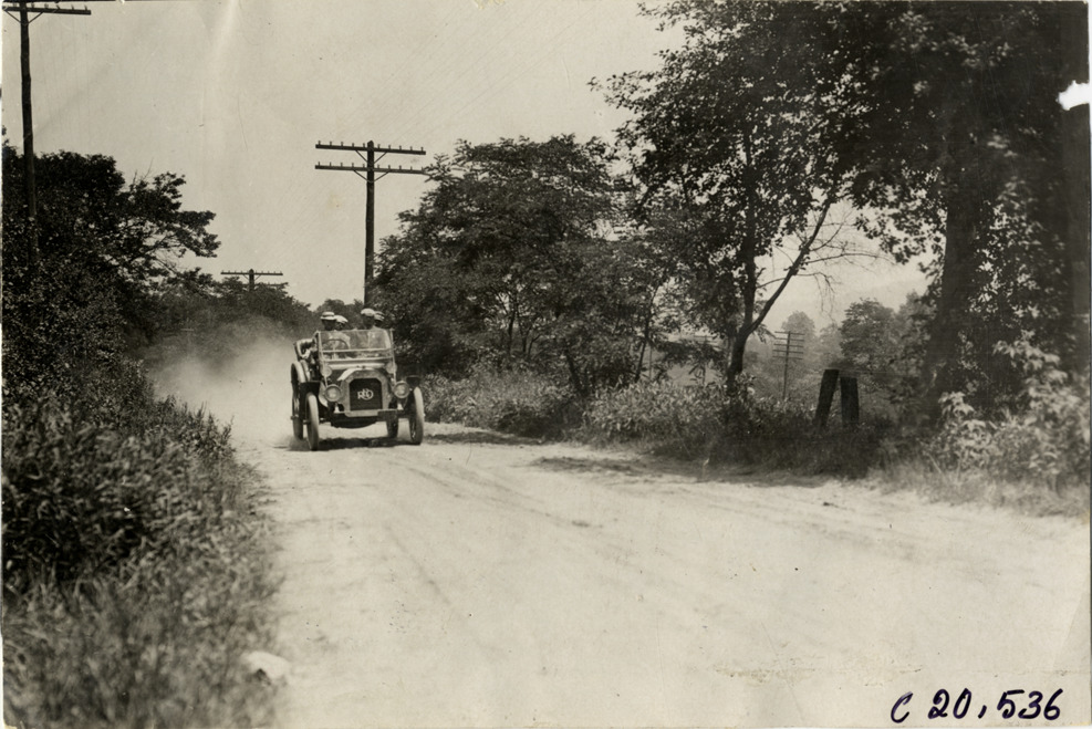 View of motorists in Reo car traveling on rural dirt road near Pittsburgh, Pennsylvania during the 1908 Glidden Tour. Handwritten on back: "Reo, #4 outside Pittsburgh. Tours--Glidden Tour, 1908."