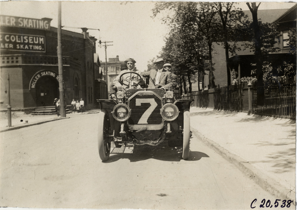 Front view of motorists posing in Peerless car no. 7 at Buffalo, New York during the 1908 Glidden Tour. Coliseum roller skating rink in background. Handwritten on back: "Tours--Glidden Tour, 1908."